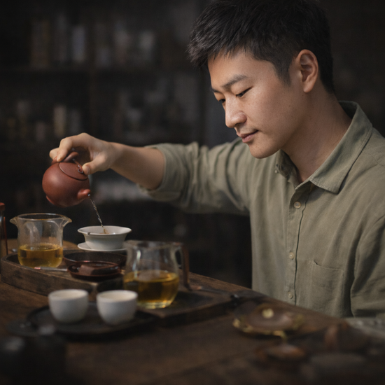 茶世家第四代传人。专注于茶汤风味的科学开发与创新研究,以年轻视角重新定义乌龙茶的多元感官层次。A 4th-generation tea scion. Focusing on scientific R&D and innovative brewing, Yuan San redefines the Oolong experience for the modern generation.